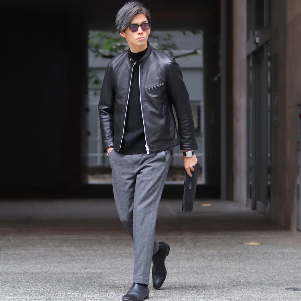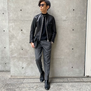 当店のおすすめはヘリンボーンスラックス白シャツとレザーライダースジャケットの