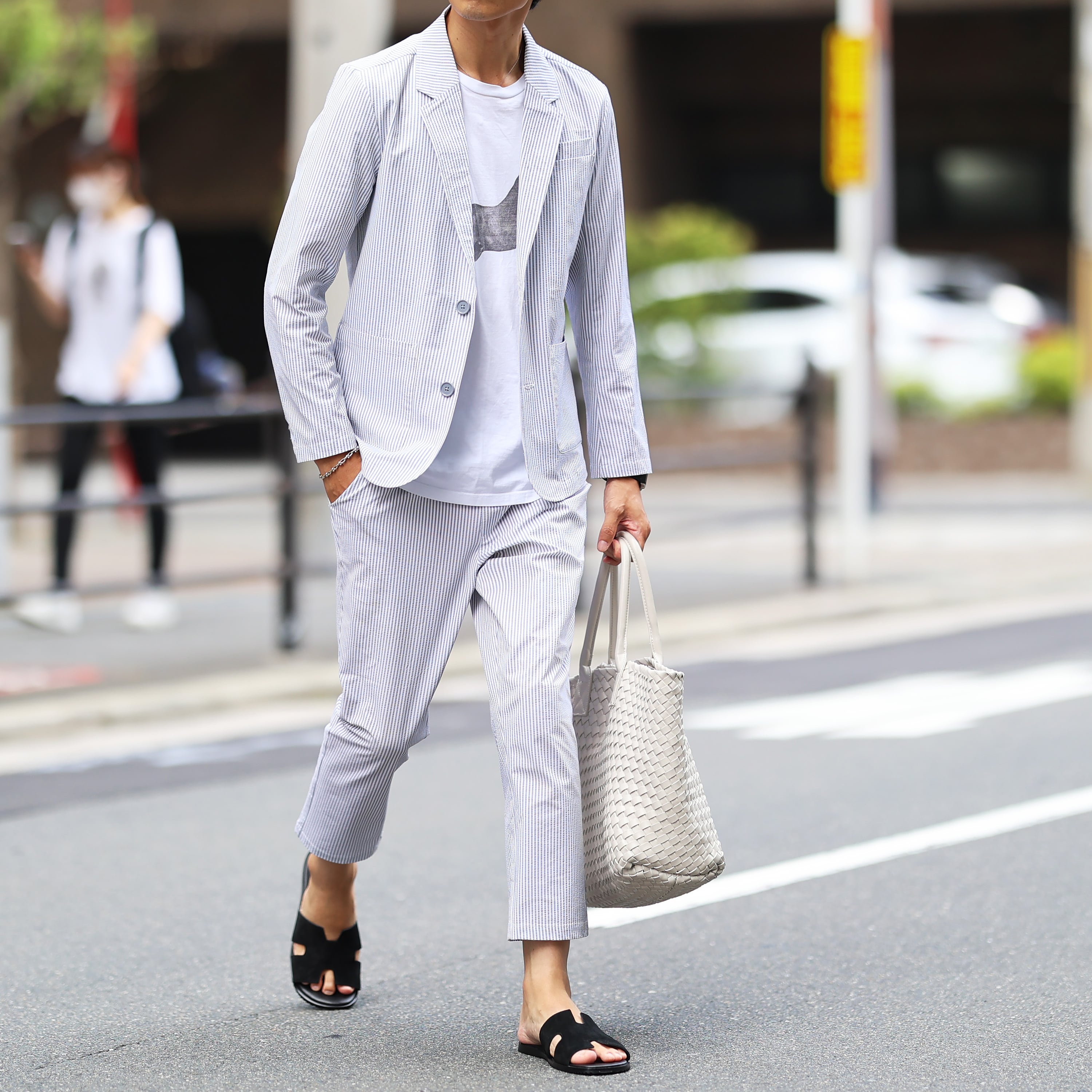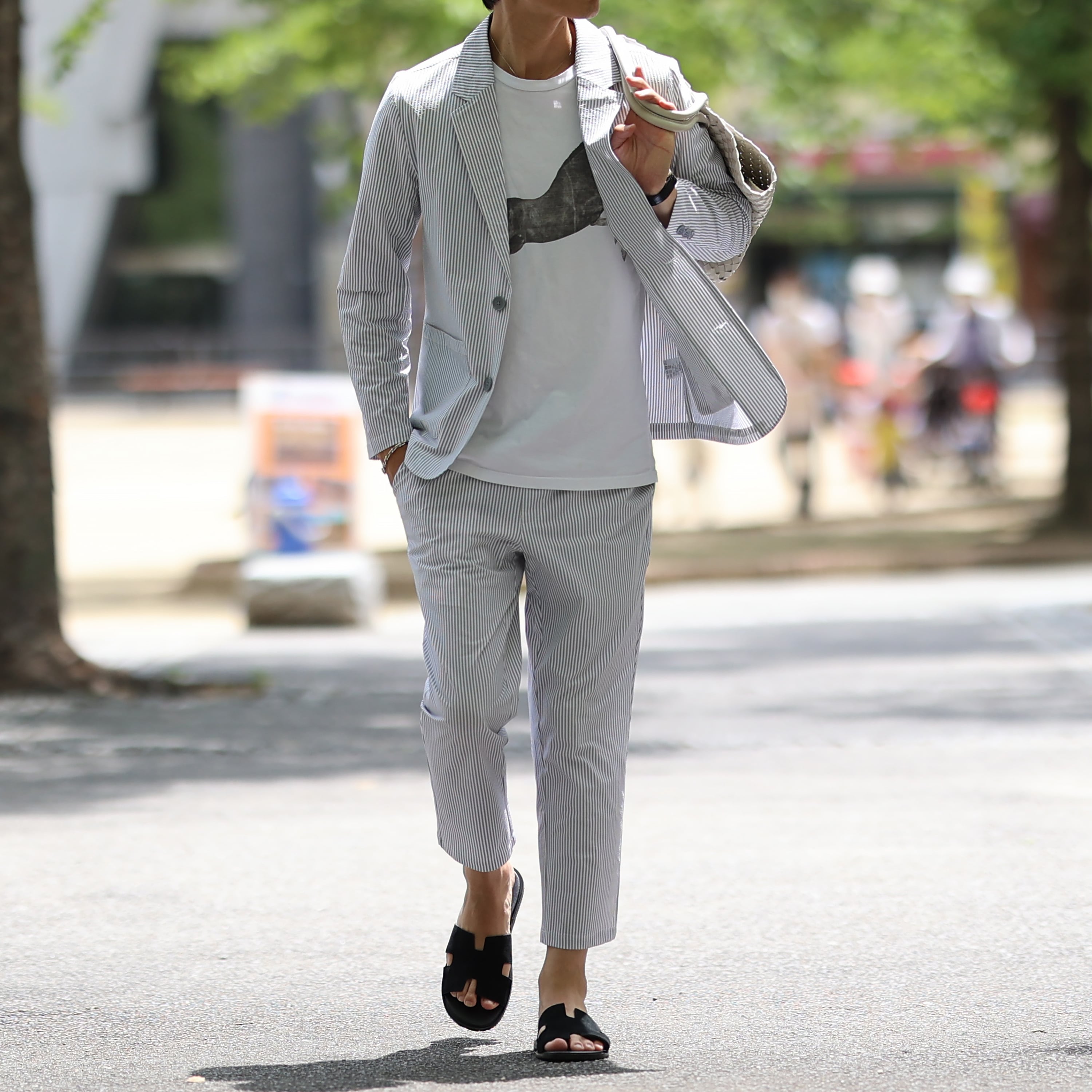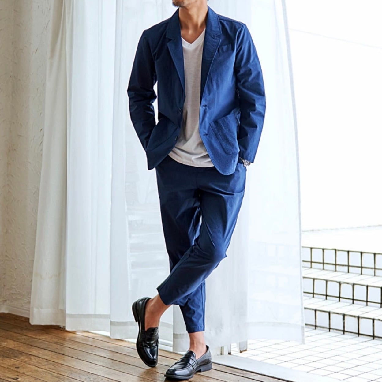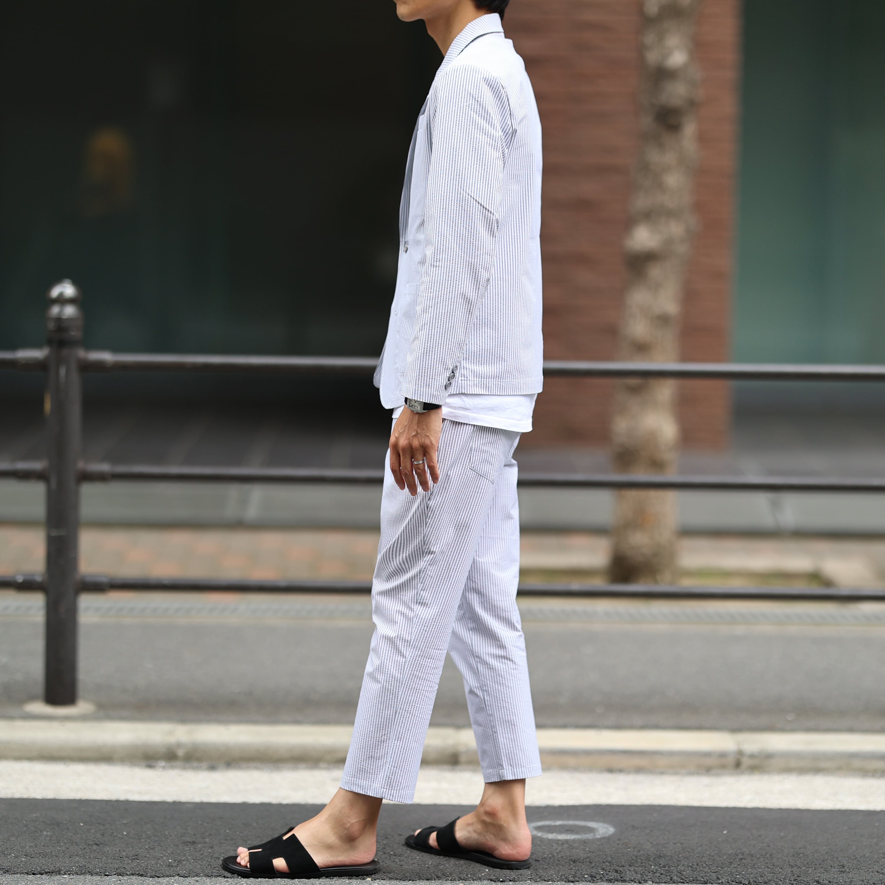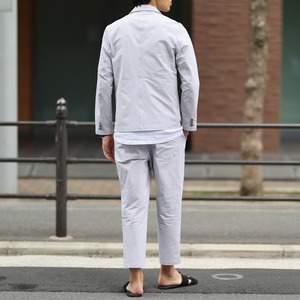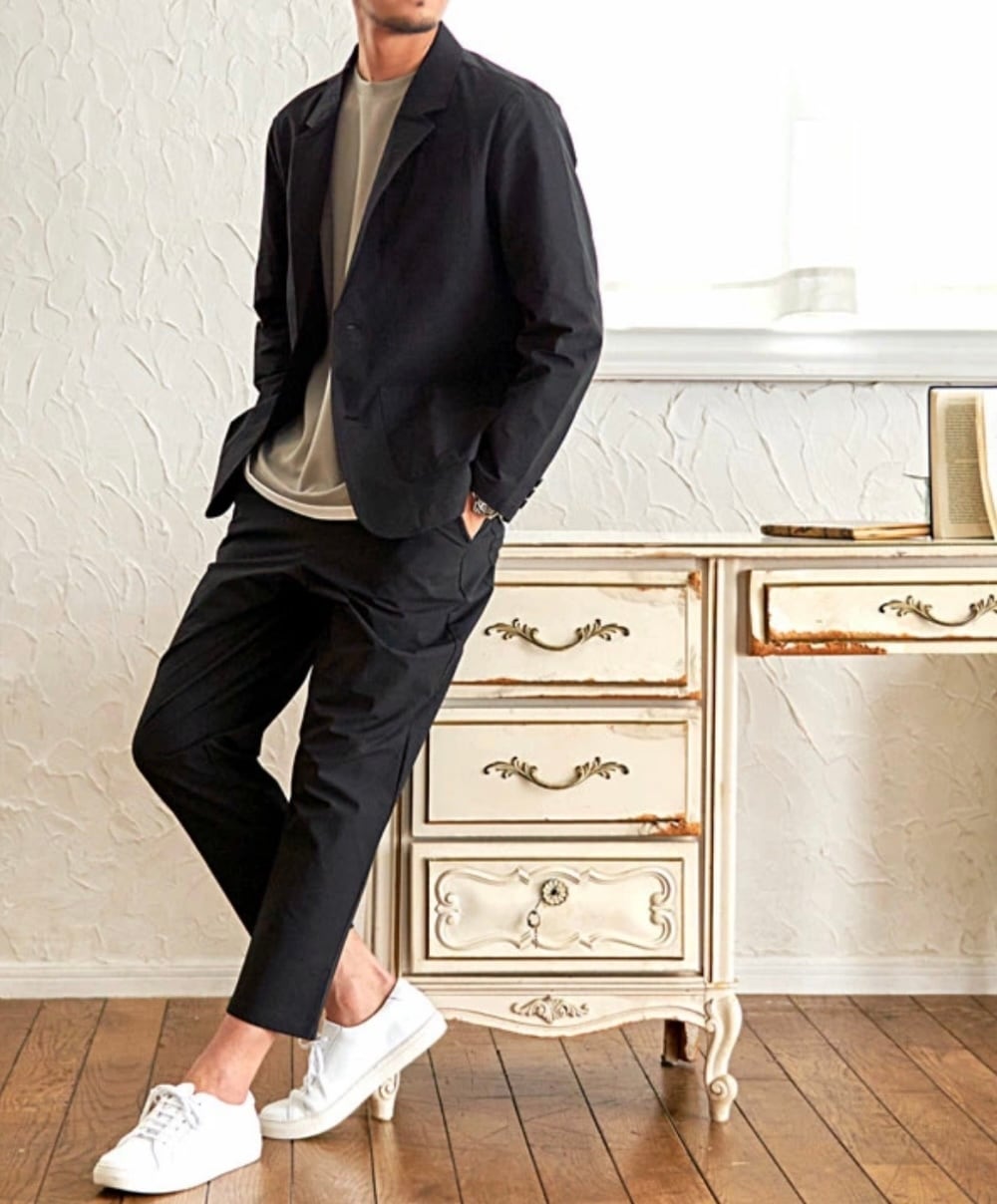 テーラードジャケットとアンクルパンツのセットアップ。