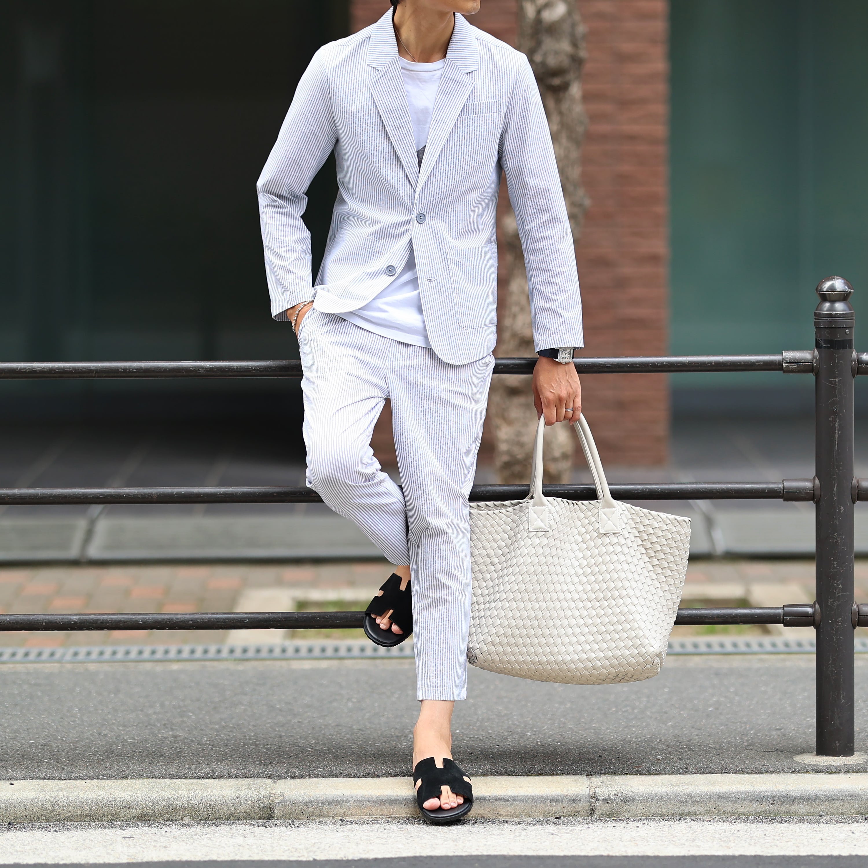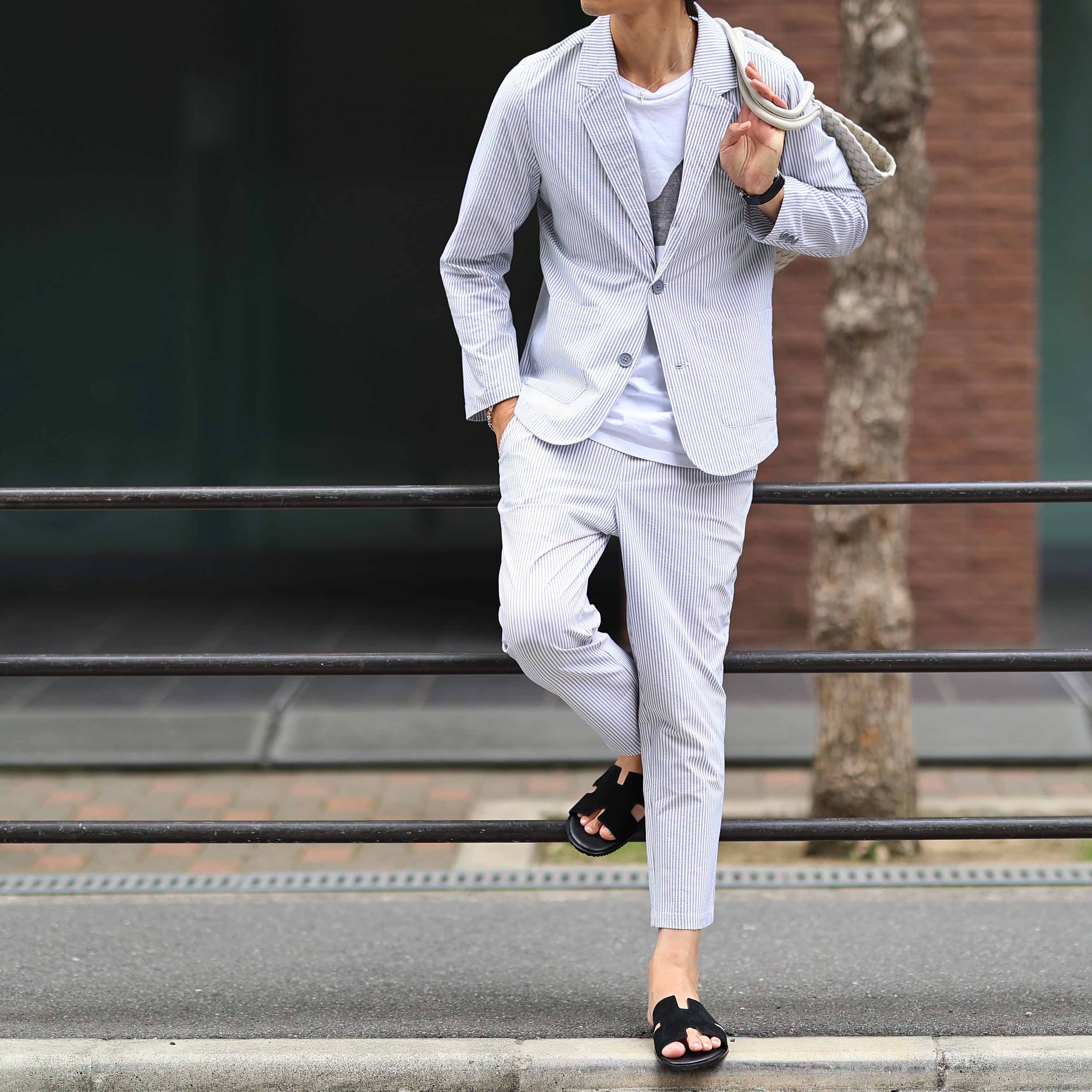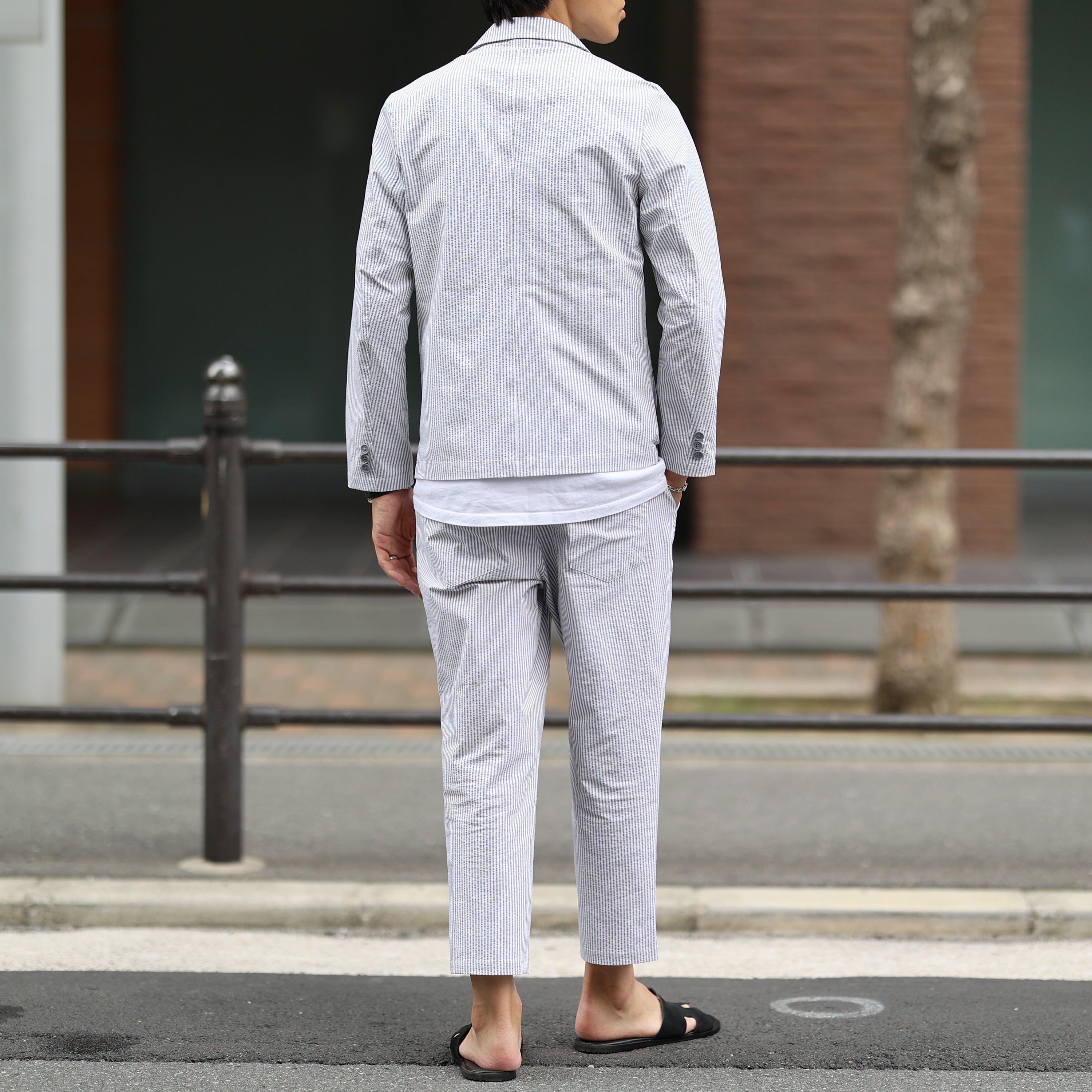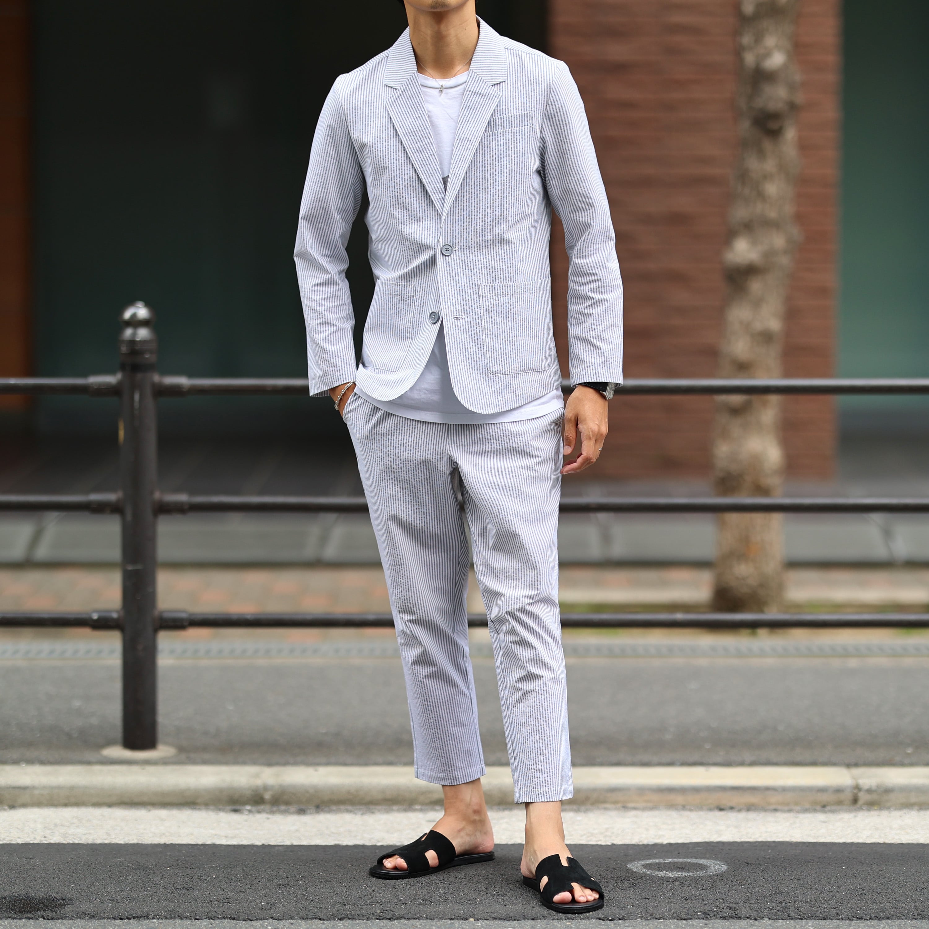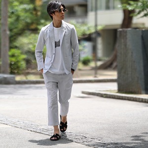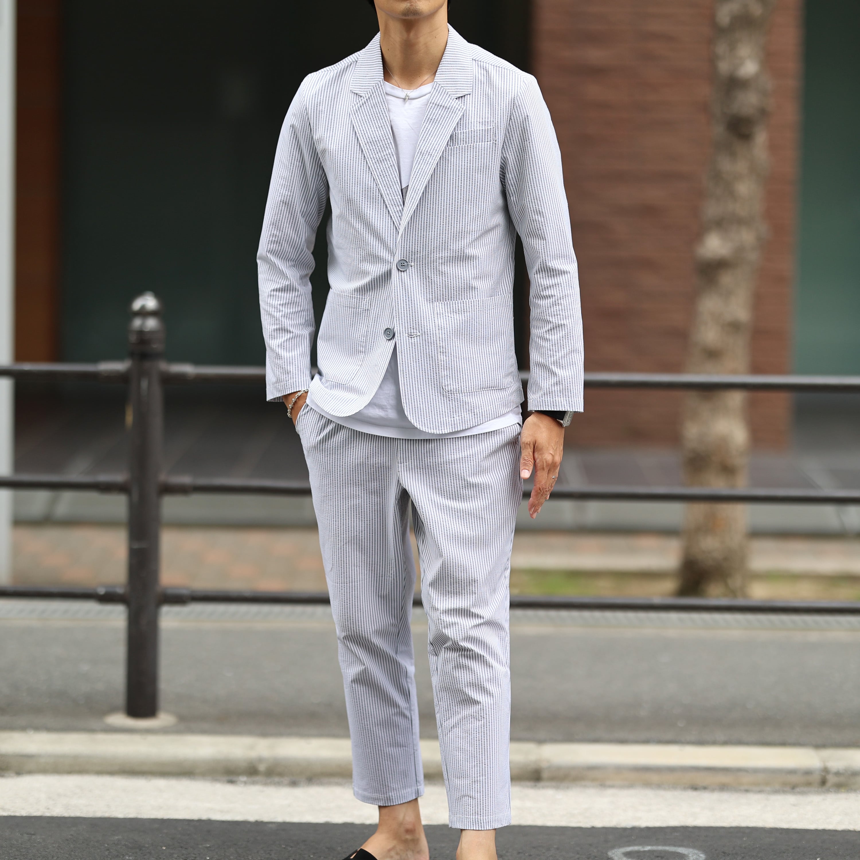 (13800円→10800円)【グレーXL即納】(ストレッチ抜群!)シアサッカーシングルセットアップ