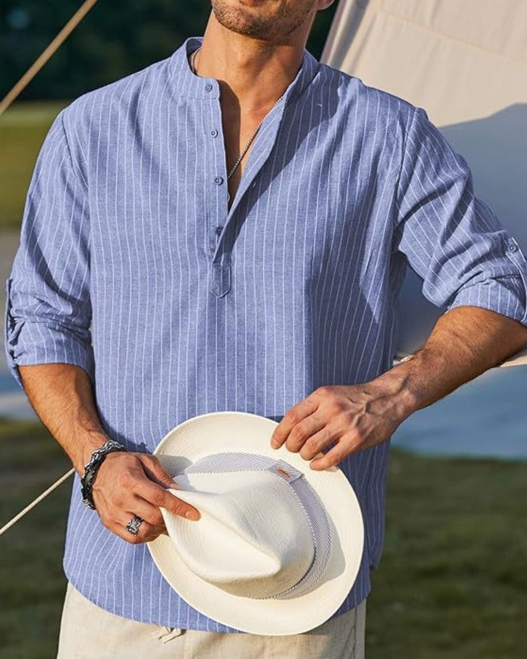 バンドカラー×スキッパーシャツは