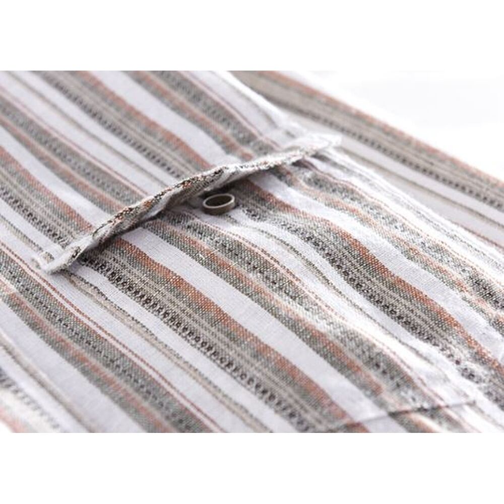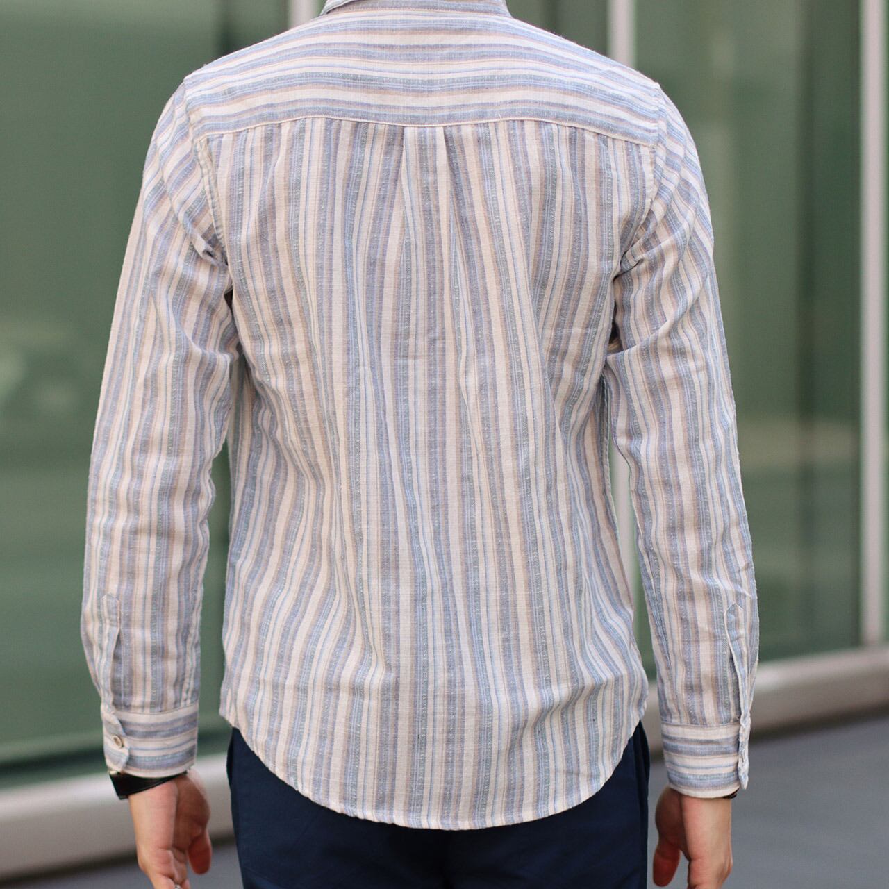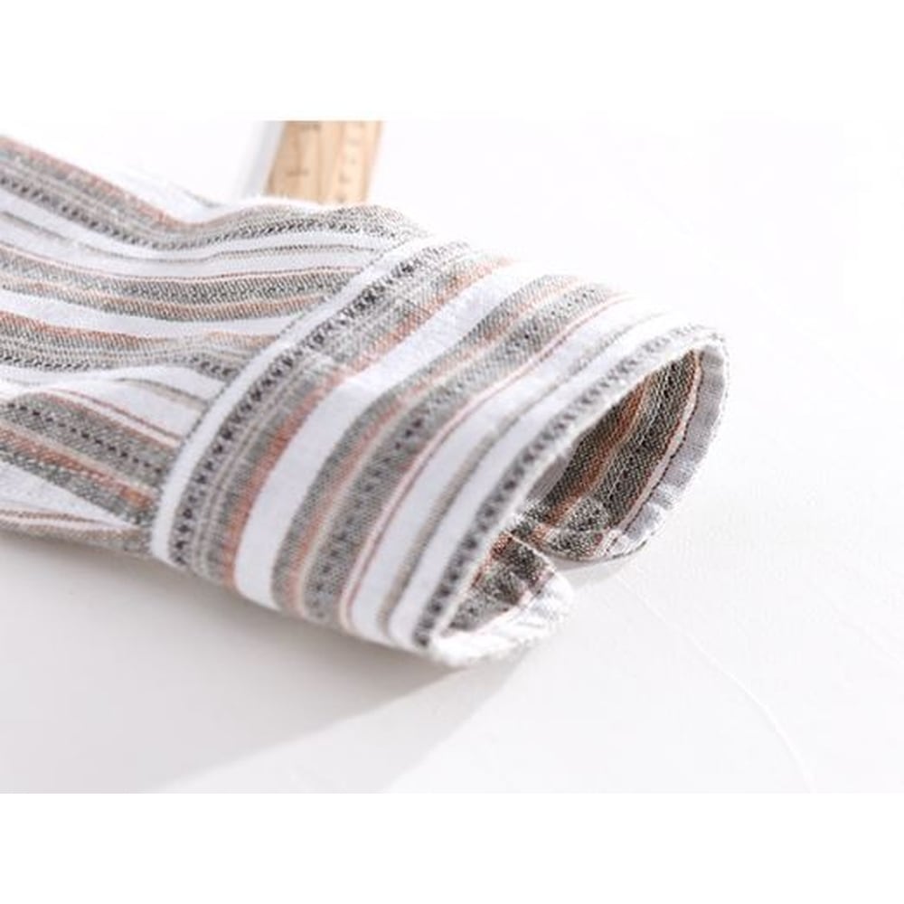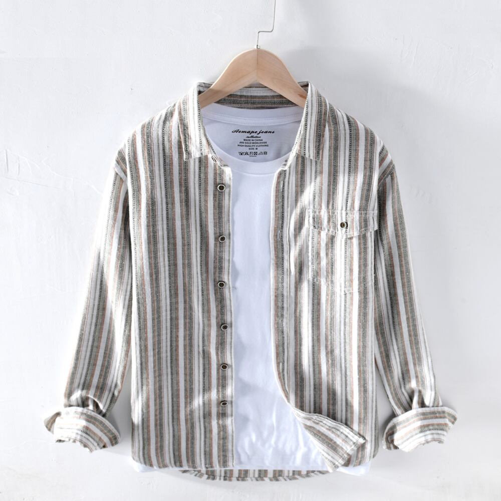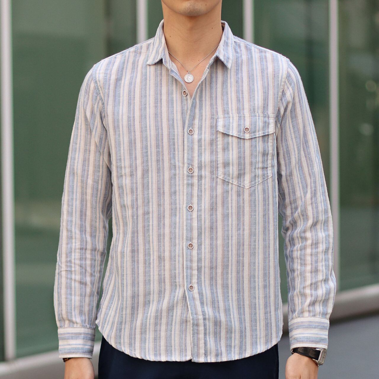 爽やかで万能にカジュアル使いできるマルチストライプ柄のリネン混シャツ。