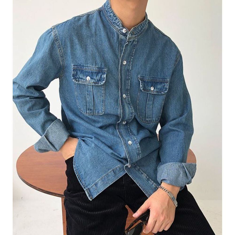 <2021SS>ノーカラーカジュアルブルーデニムシャツ
