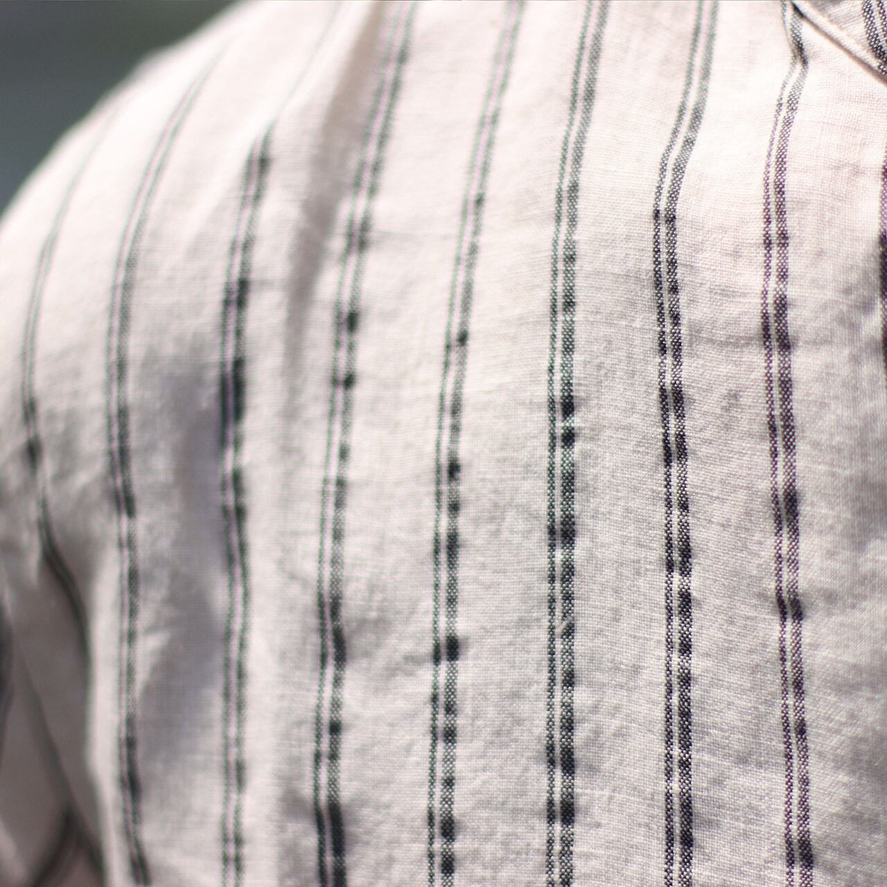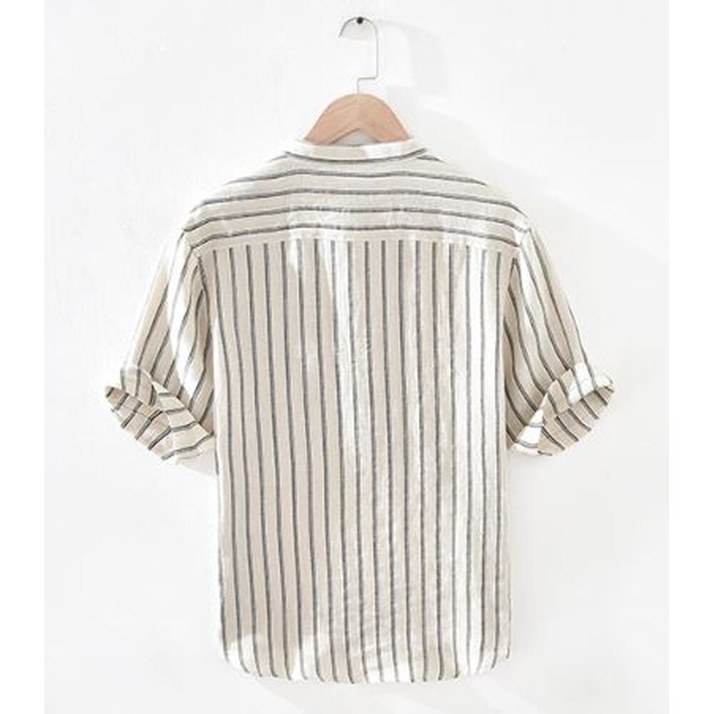 <リネン100%>ストライプヘンリーリネン5分丈シャツ 3色展開