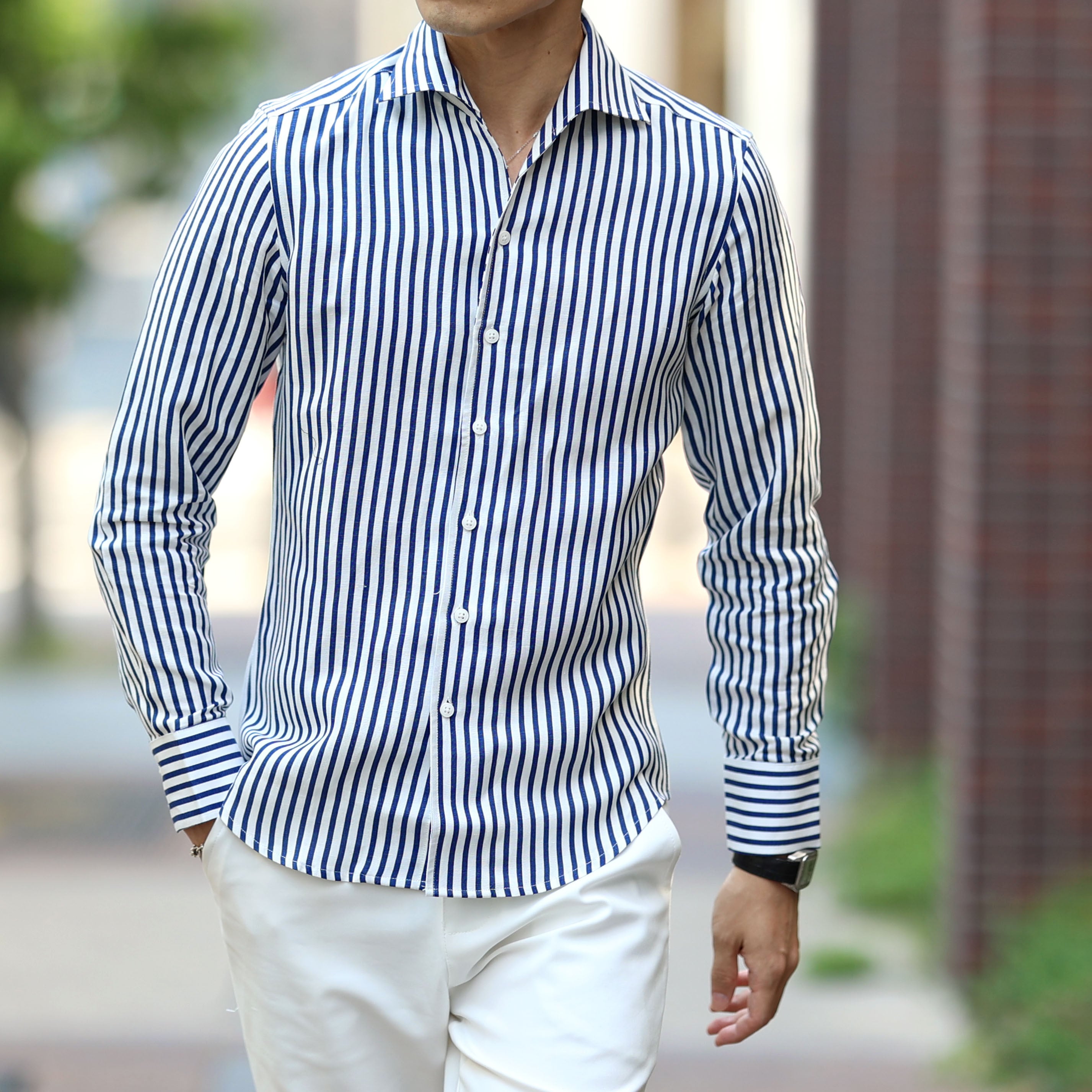 BV_(高品質シリーズ/リネン素材)イタリアンカラーネイビーストライプシャツ