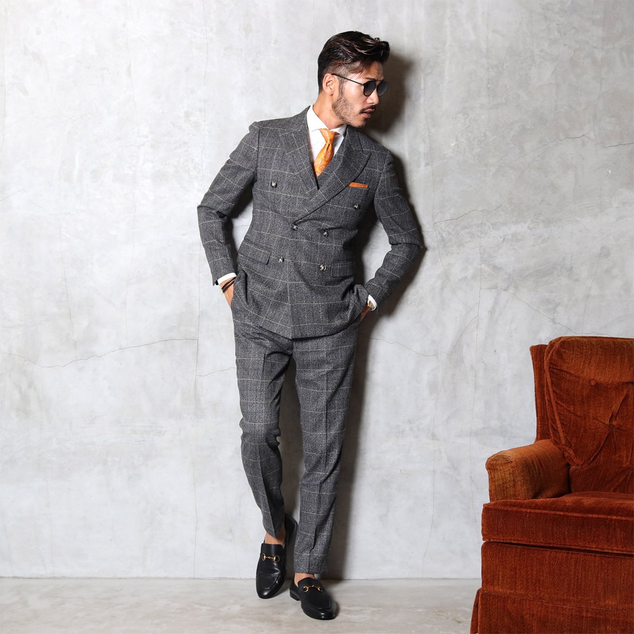 【Sサイズのみ残り即納】スーツ1番人気!<3点セット>グレンチェックダブル3Pスーツ
